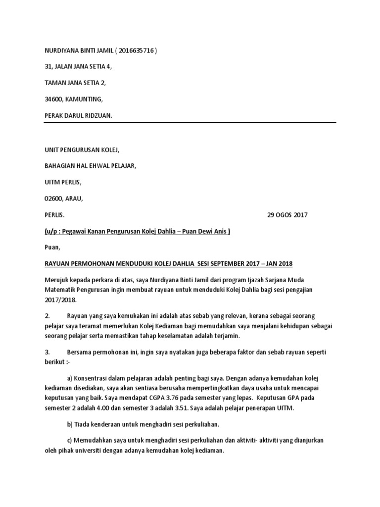 Contoh Surat Rayuan Menduduki Kolej Kediaman Uitm Kuora D